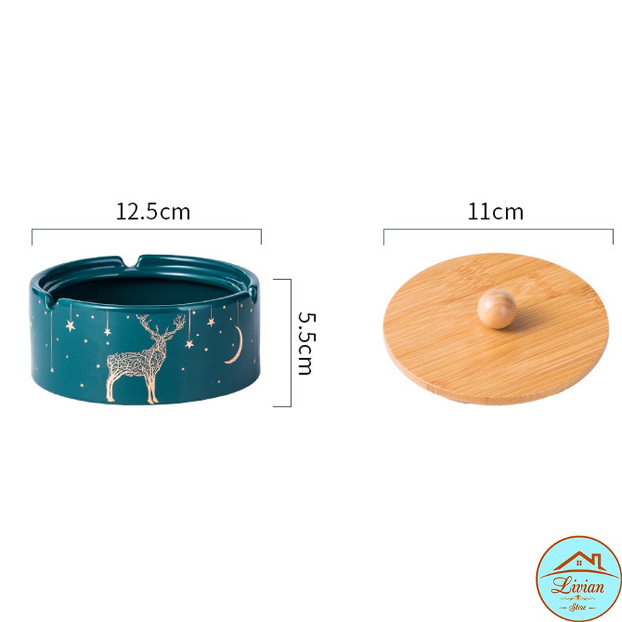 Gạt tàn thuốc lá bằng sứ có nắp - xanh cổ vịt - họa tiết hình hươu - HÀNG CÓ SẴN