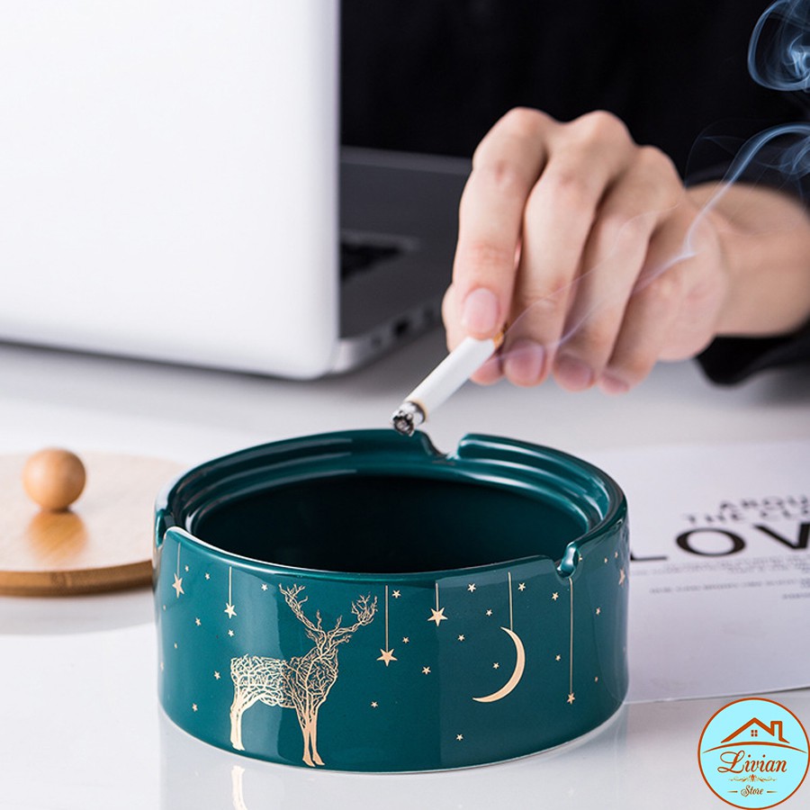 🌼 Gạt tàn thuốc lá bằng sứ có 3 họa tiết hình hươu ánh vàng kết hợp với màu xanh cổ vịt trông rất sang trọng, lịch lãm và cá tính.