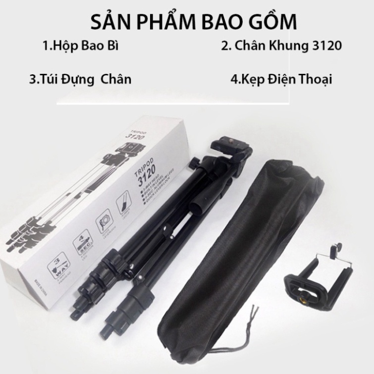 Gậy 3 chân chụp hình máy ảnh, điện thoại Tripod TF - 3120 loại tốtSản phẩm bao gồm 1 thân tripod + 1 giá kẹp điện thoại ( tối đa 6.3 inch) + 1 bao đựng tripod +1 hộp đựng / Remote bluetooth dùng để chụp hình từ xa cho điện thoại ( không quay phim được) các bạn mua chọn phân loại hàng có remote
