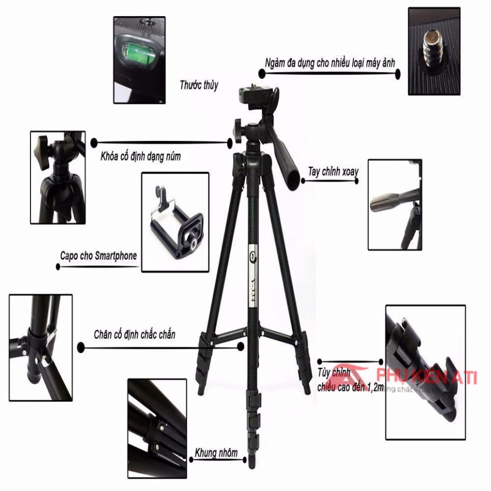 - Tripod Hợp Kim TF-3120 Cho Điện Thoại hỗ trợ cho máy ảnh compact, camera hành trình hoặc điện thoại trong việc quay phim, chụp ảnh, có thể sử dụng thuận tiện cả trong nhà và ngoài trời.