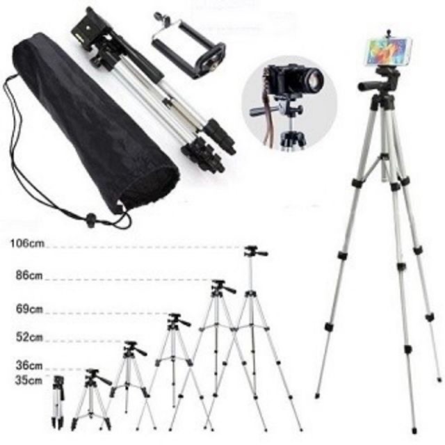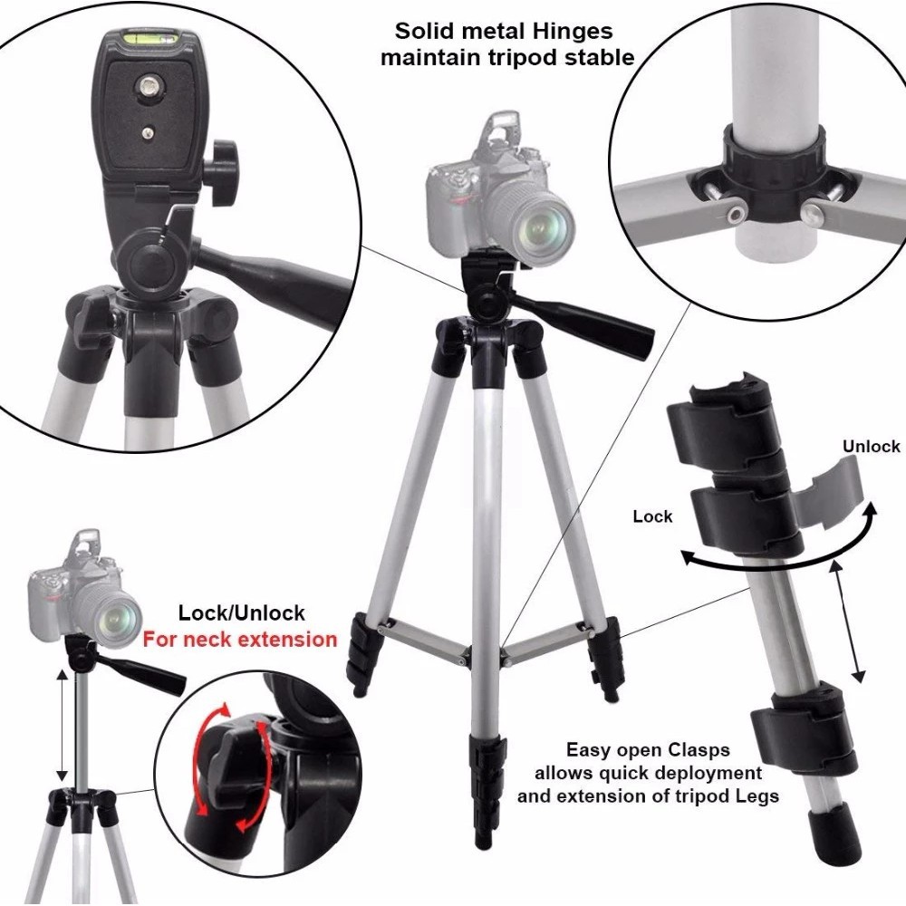- Chân máy ảnh tripod 3110 tích hợp có thể gắn cả dòng máy ảnh DSLR, máy kỹ thuật số và sản phẩm còn có giã đỡ điện thoại, phù hợp cho nhiều dòng điện thoại khác nhau. Đặc biệt cò đồng hồ nước canh thăng bằng.