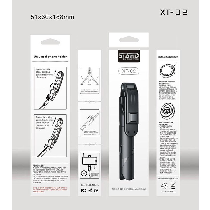 - Gậy tự sướng 3 chân Bluetooth XT02 là một sản phẩm “lai” giữa gậy tự sướng với chân chụp ảnh (tripod). Thiết kế Tripod 3 chân gọn gàng, chắc chắn, bạn không cần đến phó nháy vẫn có được 1 bức ảnh đẹp từ mọi góc độ. Với chiếc gậy tự sướng Bluetooth này, bạn thoải mái chụp cho mình những bức ảnh đẹp nhất.