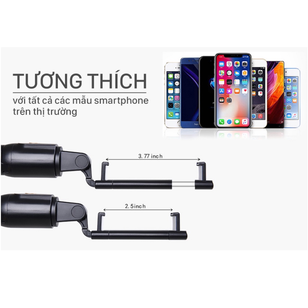 - Gậy chụp ảnh 3 chân sử dụng kết nối Bluetooth rất tiện lợi, không cần cắm dây vướng víu như các gậy tự sướng khác. Phạm vi kết nối lên đến 10m và đặc biệt tương thích với cả điện thoại của Apple và điện thoại hệ điều hành Android.