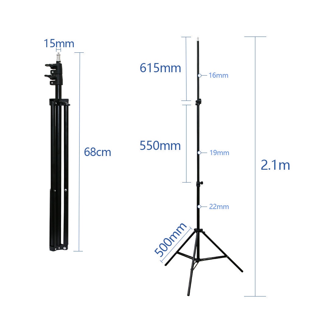 - Gậy chụp ảnh 3 chân Tripod chiều cao tối đa lên đến 2.1m, chiều dài khi gấp gọn 68cm sơn tĩnh điện màu đen. Là sản phẩm không thể thiếu của các tín đồ TikTok, Livestream hay chụp ảnh Selfie.