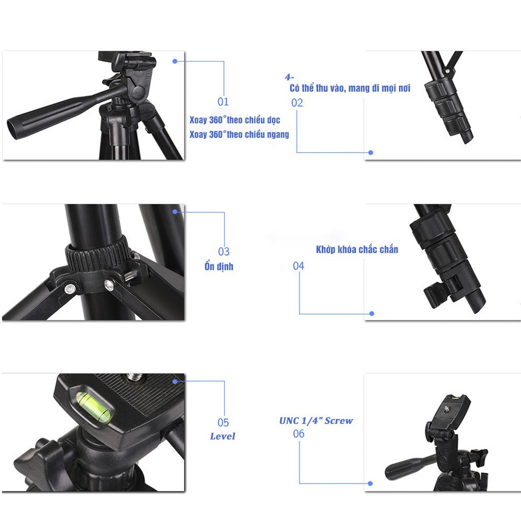 - Thiết kế 3 chân chắc chắn, có thể điều chỉnh độ dài chân lên đến hơn 1 mét