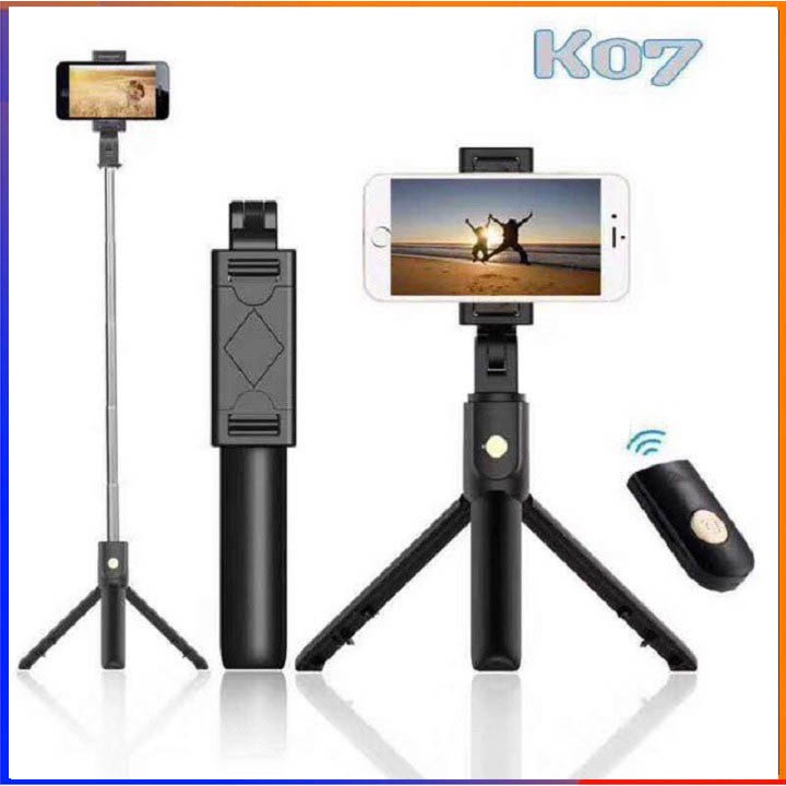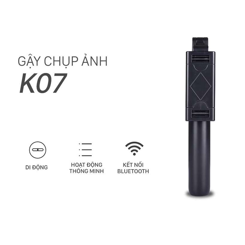 - Gậy tự sướng 3 chân Bluetooth K07 là một sản phẩm “lai” giữa gậy tự sướng với chân chụp ảnh (tripod). Thiết kế Tripod 3 chân gọn gàng, chắc chắn, bạn không cần đến phó nháy vẫn có được 1 bức ảnh đẹp từ mọi góc độ.