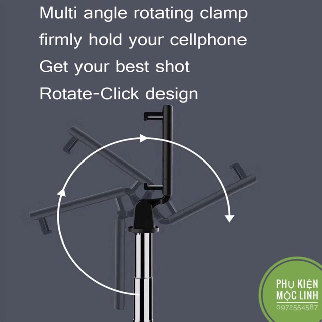 Phần kẹp giữ điện thoại có thể dùng cho điện thoại từ 4.7-6 inch với góc xoay 270 độ linh hoạt cho bạn điều chỉnh góc độ chụp dễ dàng.