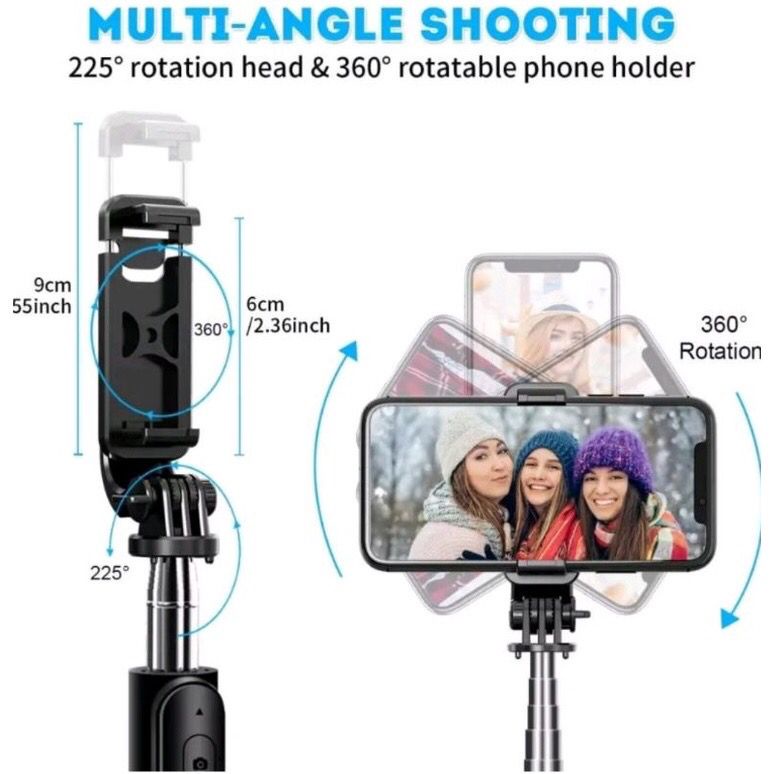 Xoay 360 ° & Điều chỉnh góc 180 °: Thiết kế này không chỉ cho phép bạn chọn các chế độ camera ngang hoặc dọc mà còn đáp ứng tốt hơn các nhu cầu góc khác nhau. Thành phần này đa dạng hơn một cây gậy tự sướng thông thường.