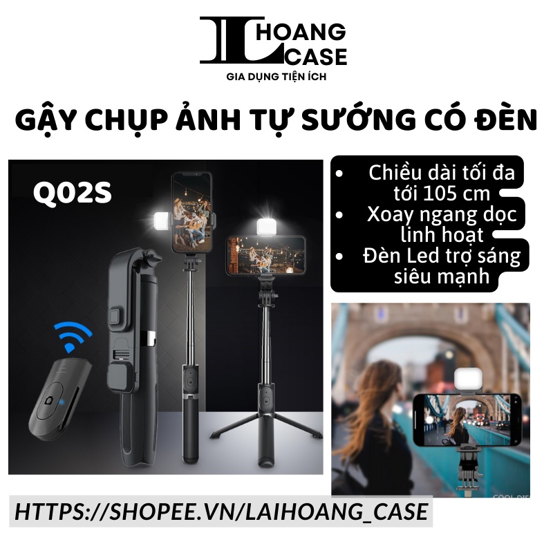 Gậy chụp ảnh Selfie Bluetooth Q02S có đèn LED kèm chân đế Tripod đa năng 4 trong 1 gấp gọn bỏ túiTính năng: Gậy chụp ảnh tự sướng, giá đỡ điện thoại xem phim, live stream, Tripod chụp ảnh từ xa với nút bấm Bluetooth và đèn Flash hỗ trợ.