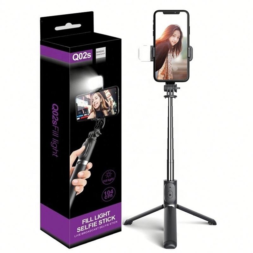 Gậy chụp ảnh Selfie Bluetooth Q02S có đèn LED kèm chân đế Tripod đa năng 4 trong 1 gấp gọn bỏ túiTính năng: Gậy chụp ảnh tự sướng, giá đỡ điện thoại xem phim, live stream, Tripod chụp ảnh từ xa với nút bấm Bluetooth và đèn Flash hỗ trợ.