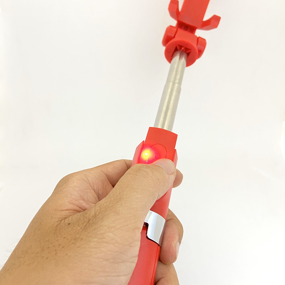 ● Đầu tiên, hãy kéo gậy ra, đẩy phần nút bấm lên trên, đó là cái remote được nhà sản xuất tích hợp rất tinh tế lên cán gậy.