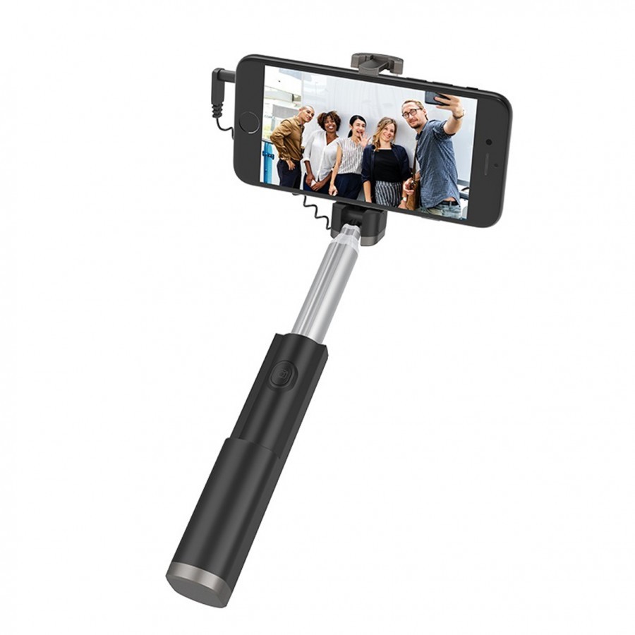 - Tích hợp nút bấm chụp ngay trên thân gậy, không cần bluetooth, bạn chỉ cần gắn dây cắm trên gậy vào chân cắm tai nghe của điện thoại là có thể chụp ảnh thoải mái.