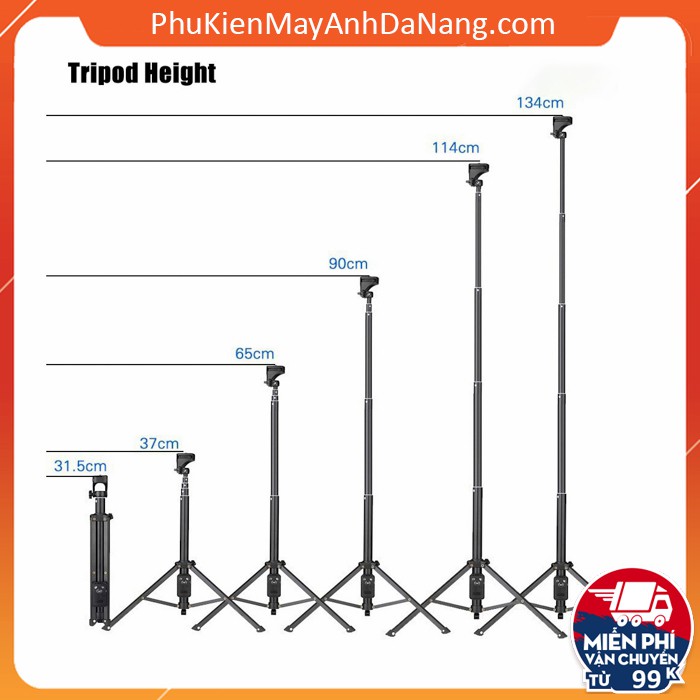 - Chiều cao tối đa 134cm (1.3m), độ cao thích hợp để có thể chụp cả người, chụp phong cảnh, chụp nhóm… mà không bị mất góc.