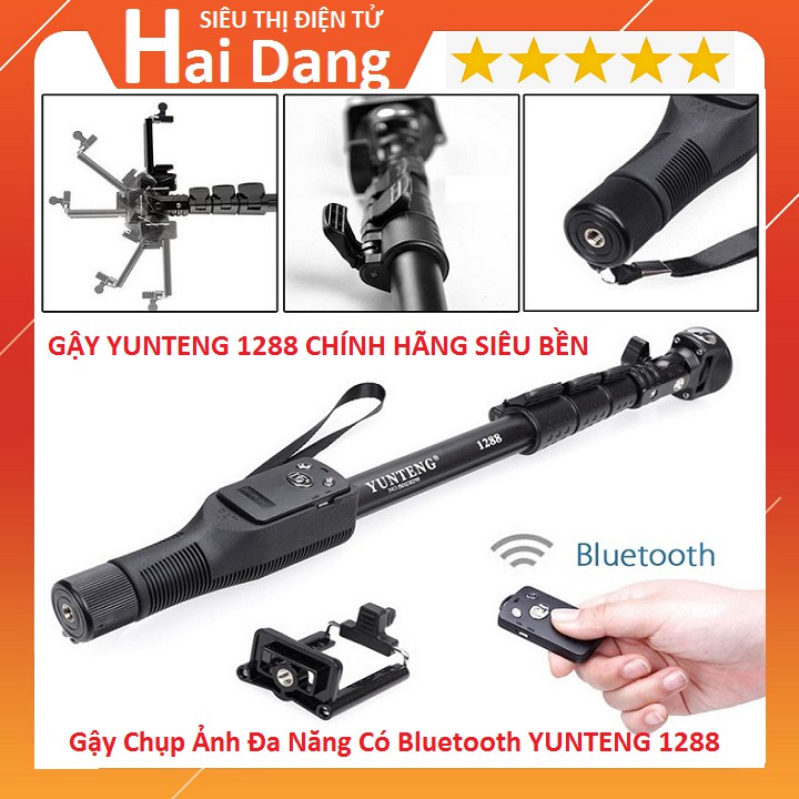Gậy Chụp Hình Đa Năng YUNTENG YT-1288 không chỉ giúp bạn tự chụp hình bằng gậy tự sướng mà còn có thể biến điện thoại và cả máy ảnh du lịch thành một chiếc máy ảnh chuyên dụng với cây gậy vững chắc không rung lắc.– Gậy chụp hình bluetooth Yunteng 1288, chiều dài tối đa cả chân 1,25m và thu gọn lại chỉ 40cm.