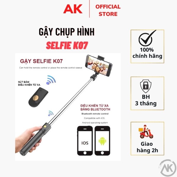 - Gậy Tự Sướng Bluetooth K07 là một sản phẩm “lai” giữa gậy tự sướng với chân chụp ảnh (tripod). Thiết kế Tripod 3 chân gọn gàng, chắc chắn, bạn không cần đến phó nháy vẫn có được 1 bức ảnh đẹp từ mọi góc độ.