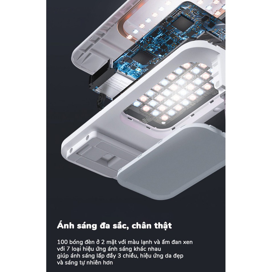 - Tích hợp 2 mặt bóng đèn led với 100 bóng đèn màu trắng và màu ấm đan xen lẫn nhau. Với 7 tùy chọn ánh sáng khác nhau, bạn có thể tùy chỉnh màu sắc ánh sáng phù hợp nhất với màu da, giúp bạn lên hình với màu sắc đẹp nhất