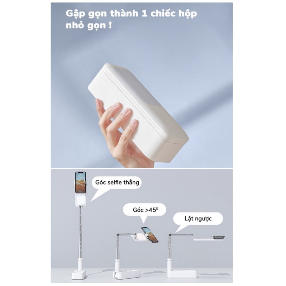 - Gậy livestream đa chức năng, gập mở gọn gàng trong 1 chiếc hộp, dễ dàng mang đi mọi nơi mà không phải mất công lắp ghép như các thiết bị khác