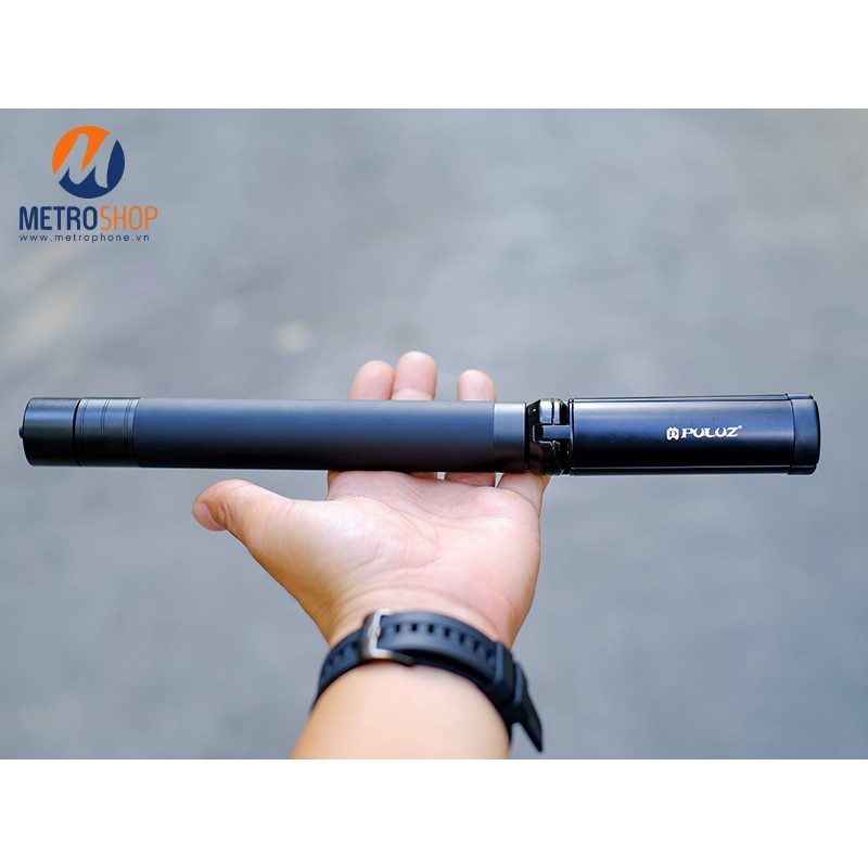 Còn đây là hình dáng của chiếc gậy này khi để ở tầm cao nhất. Khi để làm chân đứng, bạn nên thu lại 2 nấc. Đừng để cao quá sẽ gây hiện tượng rung lắc. Thật ra thì không ảnh hưởng gì đến khung hình cả. Vì chúng ta đang gắn lên Gimbal mà. Nhưng cẩn thận vẫn hơn các bạn nhé.