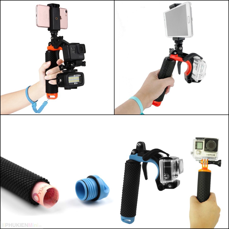 Giá đỡ tay cầm đa năng cho mọi máy ảnh, máy quay camera hành trình và điện thoại hỗ trợ 3 vị trí lắp điện thoại, gopro, đèn LED... Phù hợp cho hoạt động thể thao dưới nước: lặn biển, lặn ngắm san hô, bơi lội, lướt sóng và hoạt động ngoài trời.