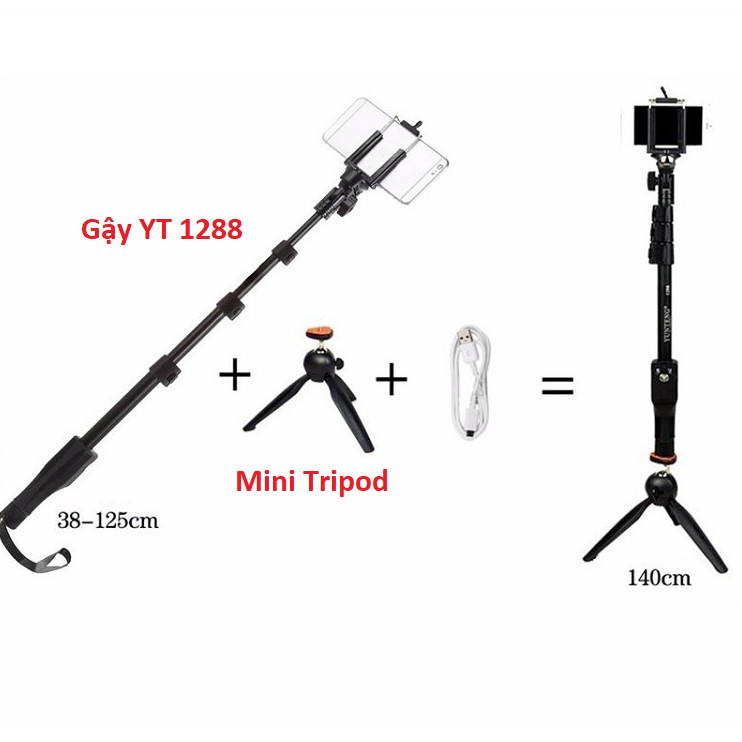 Combo gậy YT1288 + chân Tripod mini không chỉ giúp bạn tự chụp hình bằng gậy tự sướng mà còn có thể biến điện thoại và cả máy ảnh du lịch thành một chiếc máy ảnh chuyên dụng với chân đế vững chắc không rung lắc.– Gậy chụp hình bluetooth Yunteng 1288, chiều dài tối đa cả chân 1,4m và thu gọn lại chỉ 35cm.