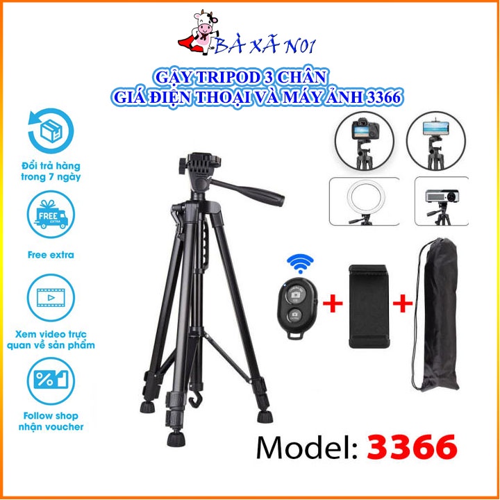- Chân đế Tripod cho điện thoại và máy ảnh 3366 là một sản phẩm hiện đại, với thiết kế nhiều tiện lợi, tân tiến hơn các mẫu tripod trước đặc biệt tặng kèm đầu kẹp điện thoại và remote bluetooth chụp ảnh đảm bảo hỗ trợ bạn chụp ảnh một cách chuyên nghiệp và dễ dàng hơn.