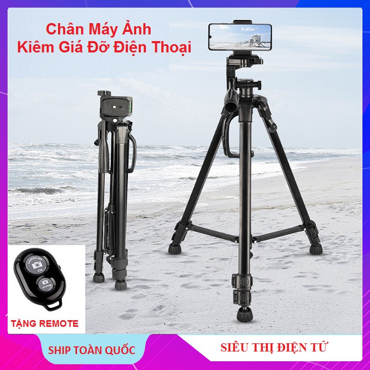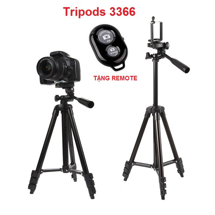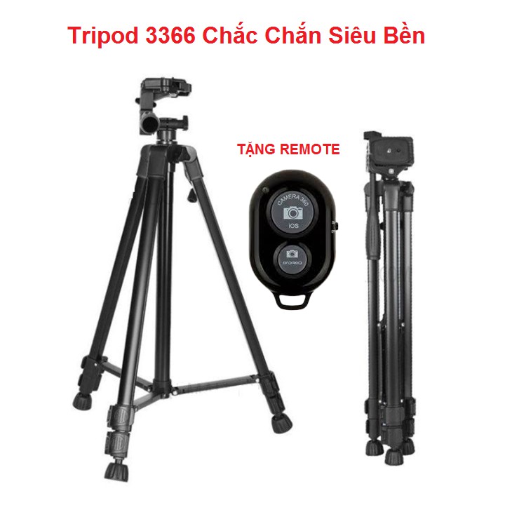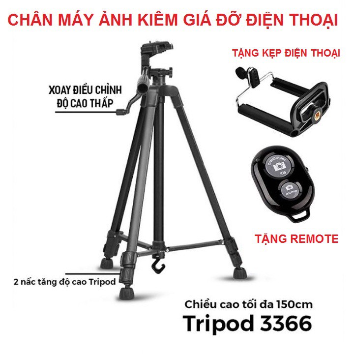 Gậy Tripod 3366, Dùng Cho Điện Thoại Và Máy Ảnh Cao 1m5 Siêu Bền - Tặng Remote Bluetooth + Kẹp Điện Thoại