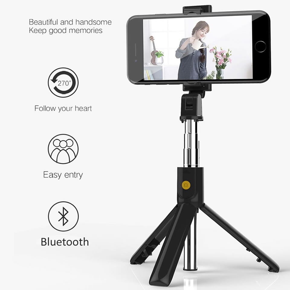 * Gậy tự sướng 3 chân Bluetooth K07 là một sản phẩm “lai” giữa gậy tự sướng với chân chụp ảnh (tripod). Thiết kế Tripod 3 chân gọn gàng, chắc chắn, bạn không cần đến phó nháy vẫn có được 1 bức ảnh đẹp từ mọi góc độ. Với chiếc gậy tự sướng Bluetooth này, bạn thoải mái chụp cho mình những bức ảnh đẹp nhất.