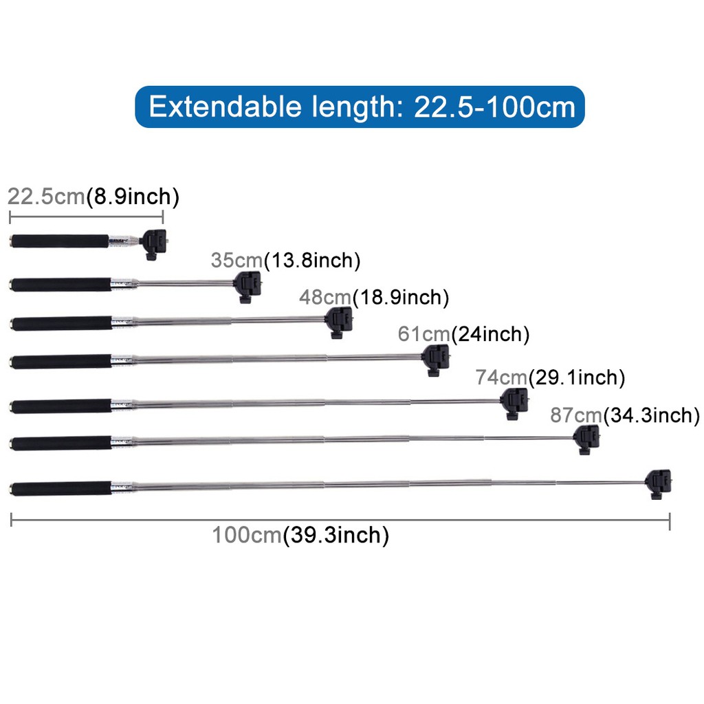 - Thiết kế chắc chắn bằng kim loại có thể kéo dài đền 100cm, hoặc điều chình chiều dài tùy thích từ 22.5cm đến 100cm