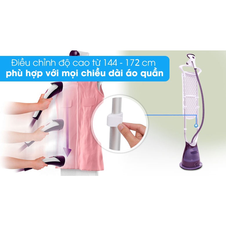 - Bàn ủi hơi nước đứng Philips GC558 với tính năng khóa cố định móc treo Hang&Lock độc đáo sẽ giữ cho quần áo được treo cố định, ngăn móc treo đung đưa qua lại hoặc bị rơi xuống