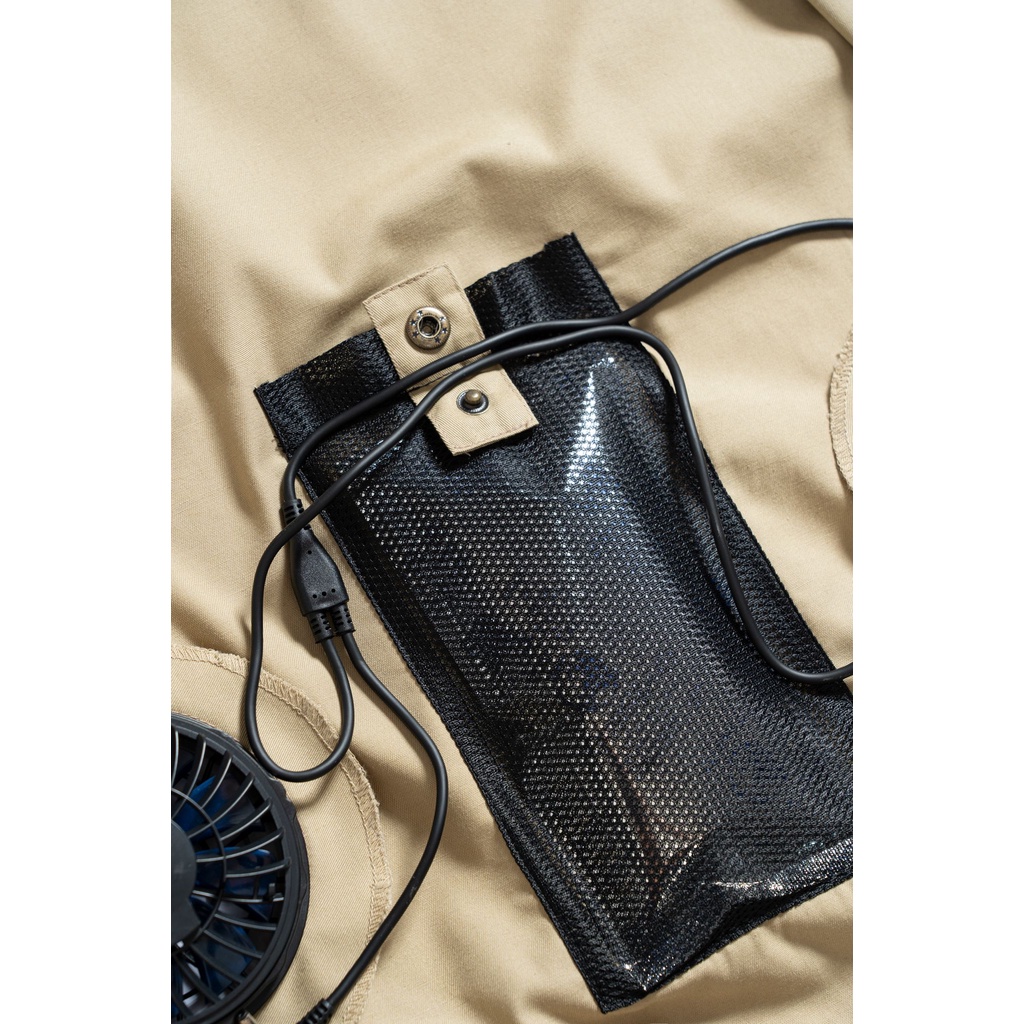Bước 2: Cho túi đá vào túi lưới bên trong áo, đóng khuy túi và mặc áo làm mát.