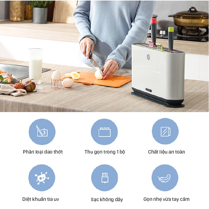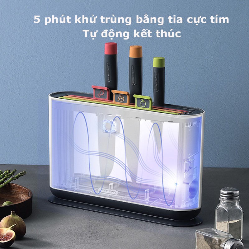 sử dụng tia UV để Tiêu diệt 99% vi khuẩn trên dao và thớt , Loại bỏ các mầm bệnh , vi khuẩn gây hại . Sử dụng đơn giản bằng 01 nút bấm , máy sẽ hoạt động trong chu kỳ 05 phút , tiếp tục lặp lại chu kỳ tiếp theo cho đến khi thớt & dao hoàn toàn sạch , máy sẽ tự động ngắt . Bạn sẽ không cần bận tâm đến việc tắt máy