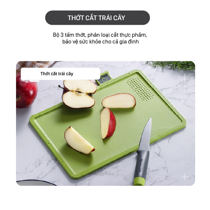 Gồm 03 thớt và 03 dao thiết kế riêng biệt , phân loại bằng màu sắc thuận tiện sử dụng . Bảo vệ chế độ ăn , uống lành mạnh cho gia đình bạn .