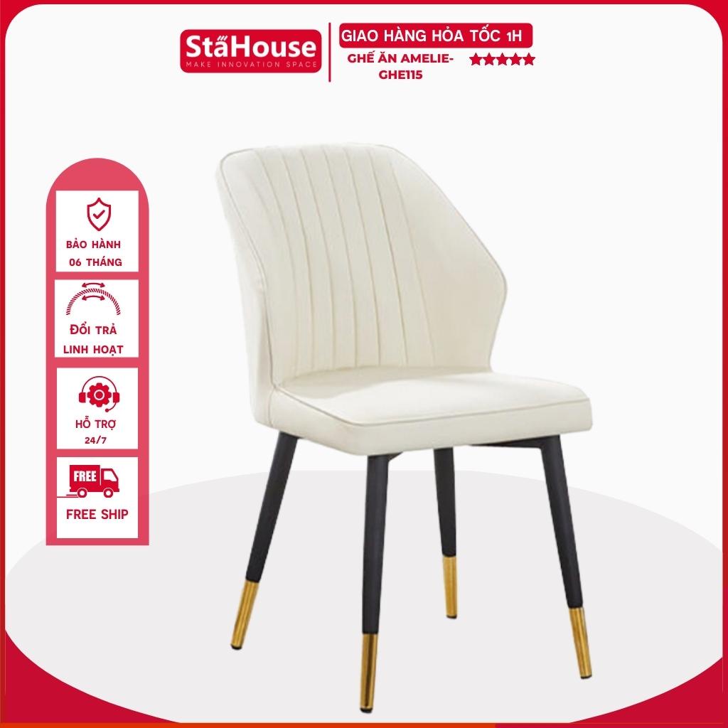 GHẾ ĂN AMELIE - GHA115Ghế ăn Amelie 100% nhập khẩu, các chi tiết được gia công tỉ mỉ, chắc chắn nên mẫu ghế này có được vẻ đẹp của sự tinh tế và bền bỉ. Phần đệm ghế mút dày êm ái bọc da cao cấp chống thấm nước, tựa lưng được thiết kế ôm thao dáng người tạo cảm giác an tâm và vững chãi. Chính vì vậy, ghế ăn Amelie được lựa chọn không chỉ cho không gian bếp ăn mà còn có thể làm ghế cafe, ghế sửa dụng cho nhà hàng, ghế làm việc tại nhà và văn phòng,...