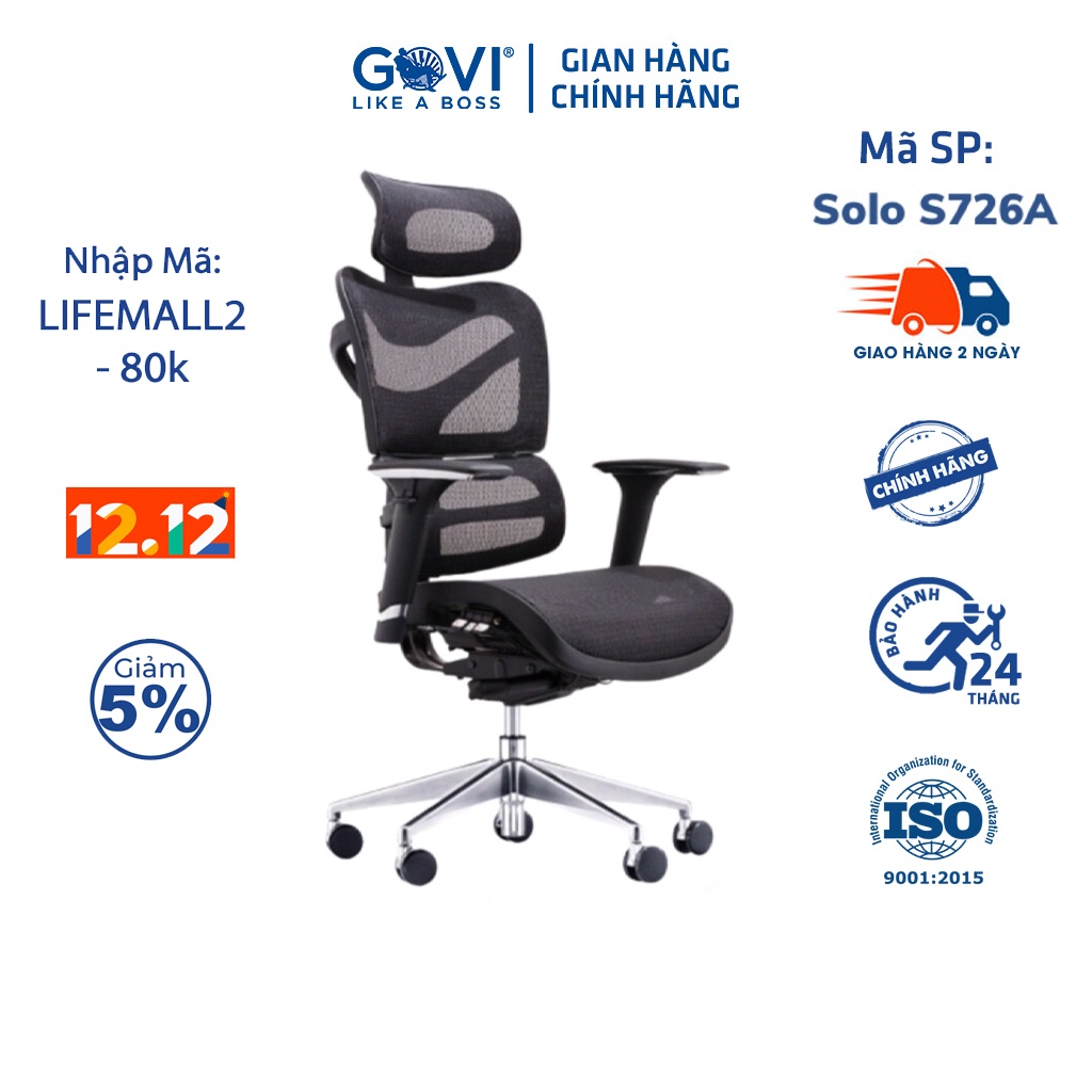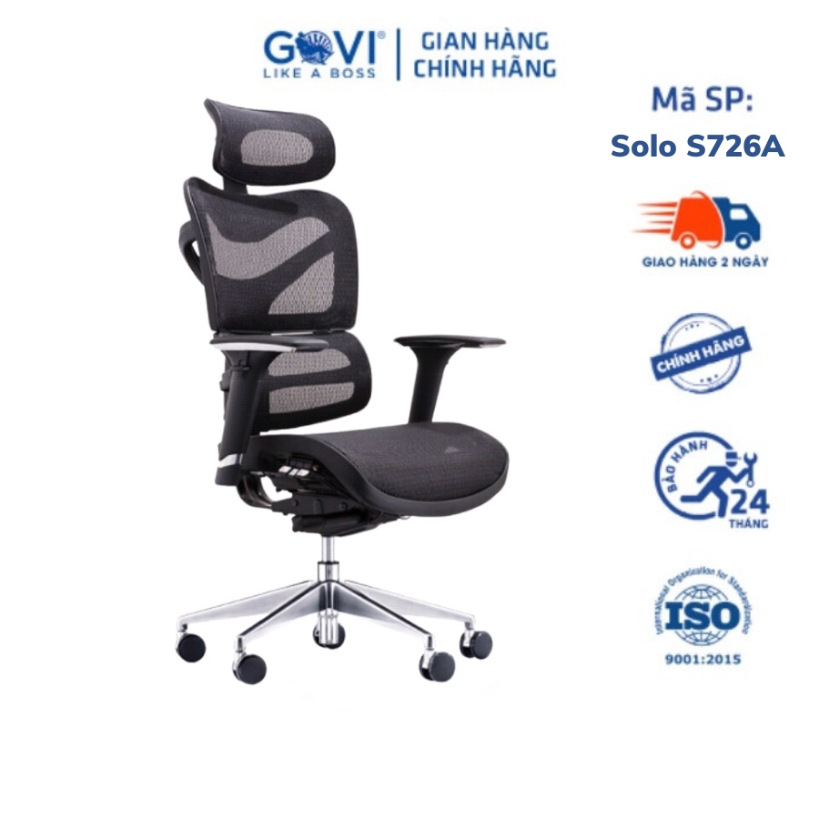 Ghế công thái học Ergonomic GOVI Solo S726A - Tựa đầu tựa tay điều chỉnh,đệm ngồi trượt trước-sau, ngả lưng từ 90-135 độ