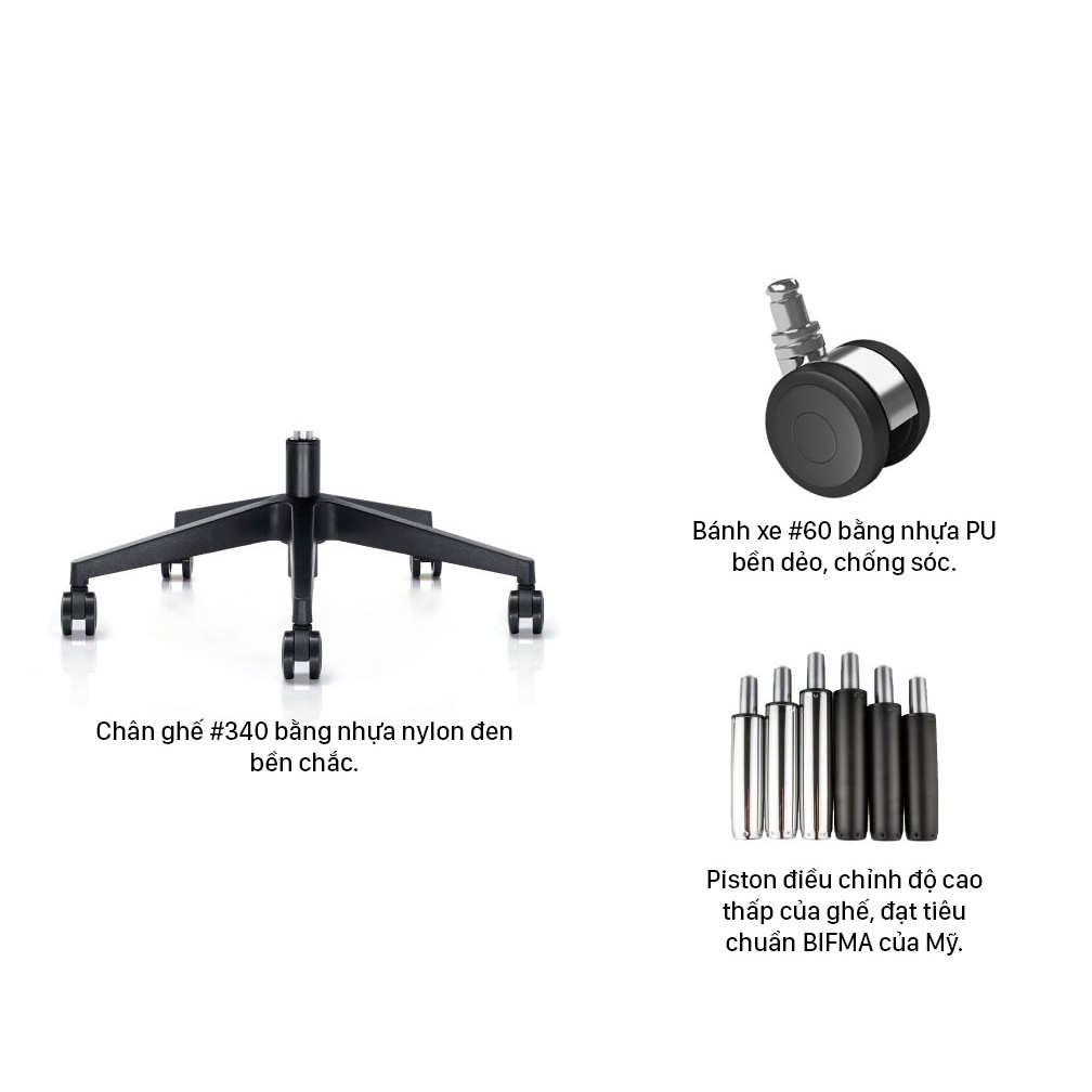 Chân ghế #340 bằng nhựa nylon đen bền chắc. Bánh xe #60 bằng nhựa PU bền dẻo, chống sóc.