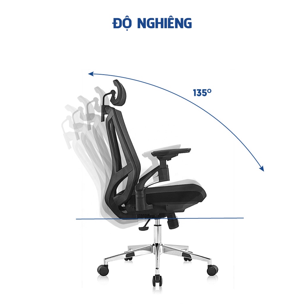 + Cơ chế đa chức năng: Mâm ghế có cơ chế ngả lưng 135 độ, khóa cố định 3 vị trí
