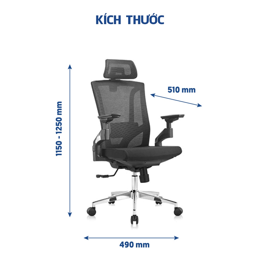 + Cơ sở cao cấp: Chân ghế #350 hợp kim nhôm. Bánh xe #60 bằng nhựa PU bền dẻo, chống sốc.