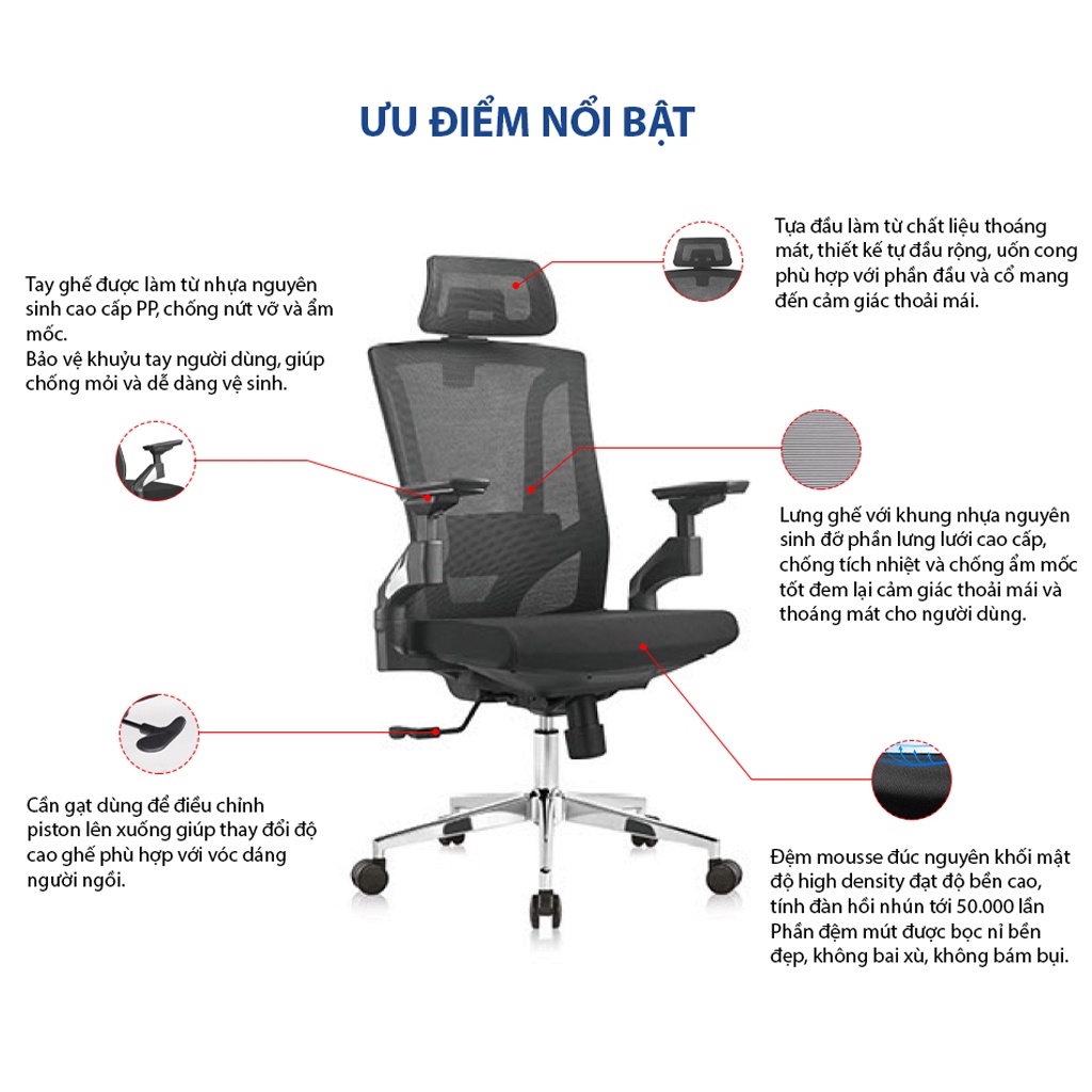+ Piston điều chỉnh độ cao thấp của ghế, đạt tiêu chuẩn BIFMA của Mỹ.