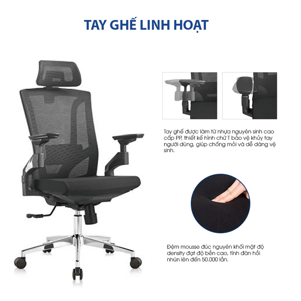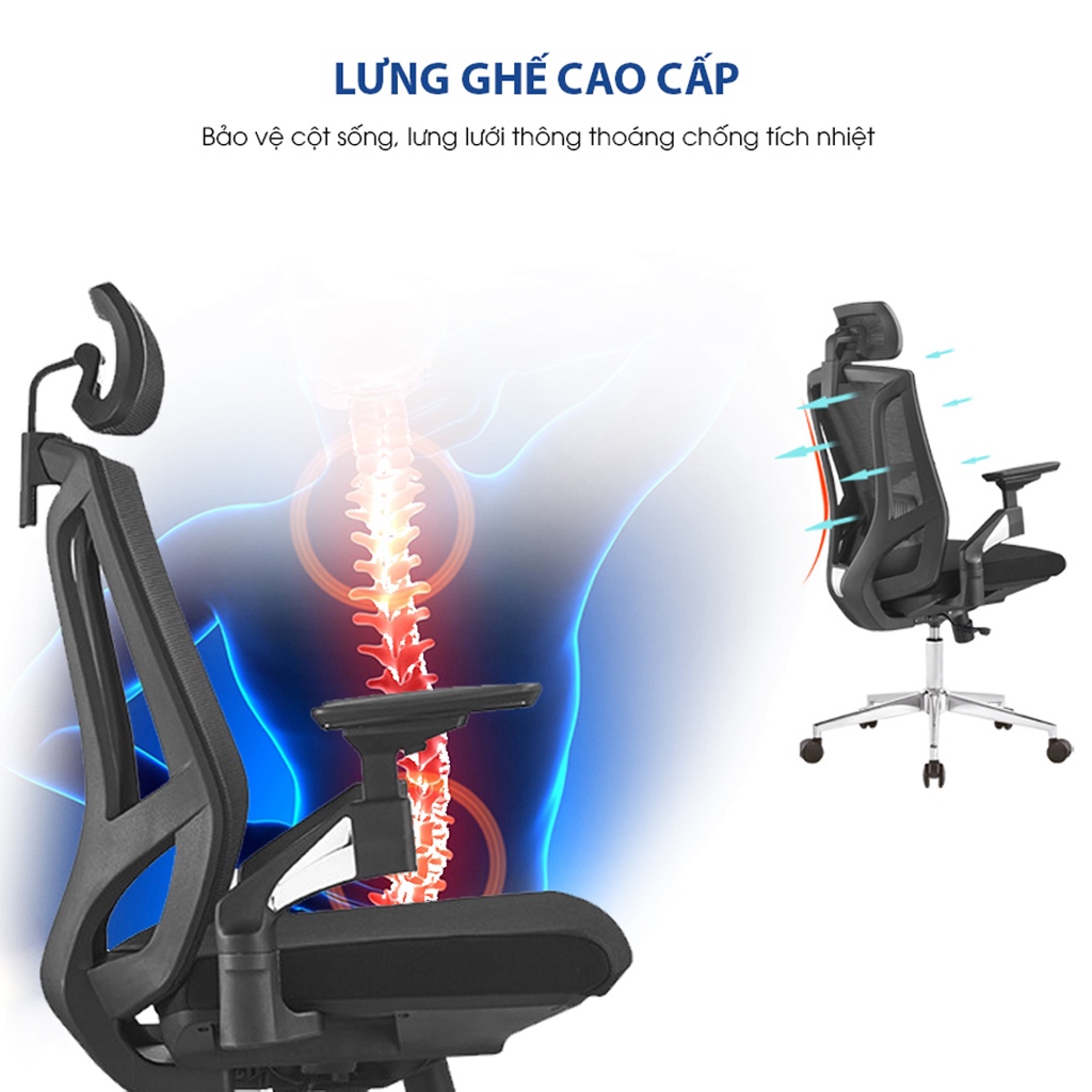 + Chiều cao thắt lưng: Khung lưng bằng nhựa nylon PA. Tựa lưng bọc vải lưới cao cấp. Đệm nhựa đỡ thắt lưng có thể điều chỉnh cao thấp, ôm sát lưng người ngồi.