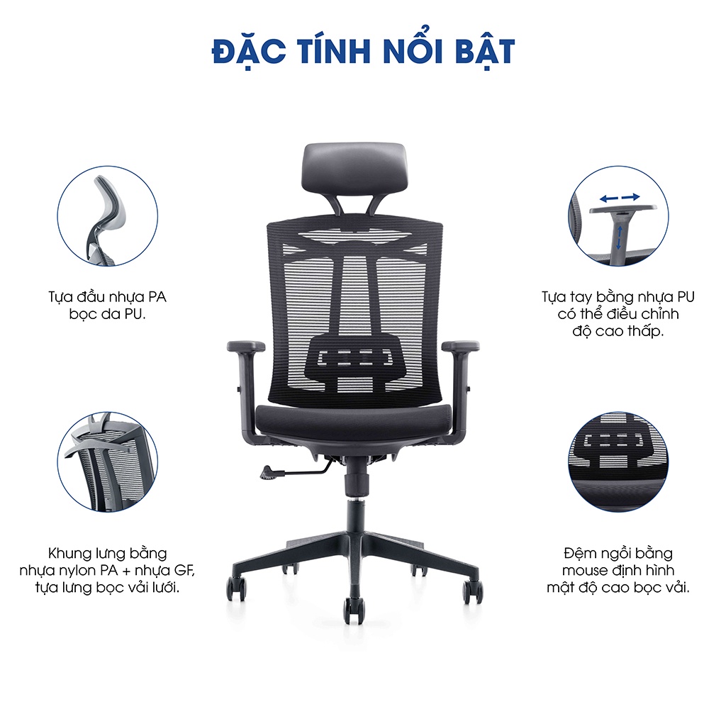 Giới thiệu Ghế công thái học Ergonomic GOVI Felix F6206A-2 - Tựa đầu cố định, tựa tay điều chỉnh, mâm ghế ngả sau, khóa 1 vị trí