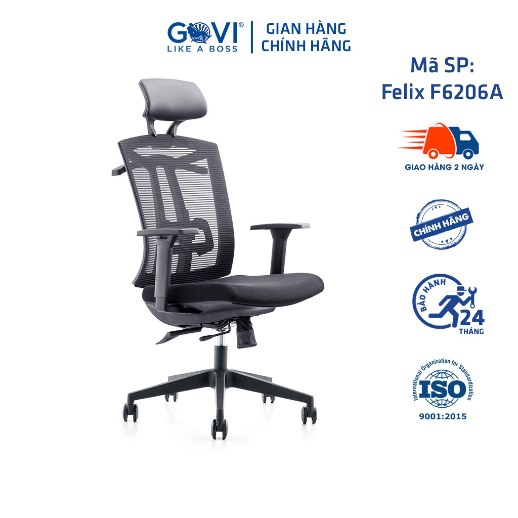 Ghế công thái học Ergonomic GOVI Felix F6206A-2 - Tựa đầu cố định, tựa tay điều chỉnh, mâm ghế ngả sau, khóa 1 vị trí