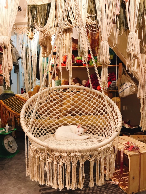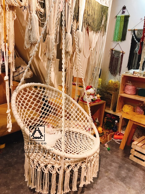 ghế đu Macrame / Macrame hanging chairSize: vòng nhỏ ngồi 60cm, rộng 80cm, tựa lưng 45cm, dây treo 150cm bằng cáp thép chắc chắn.