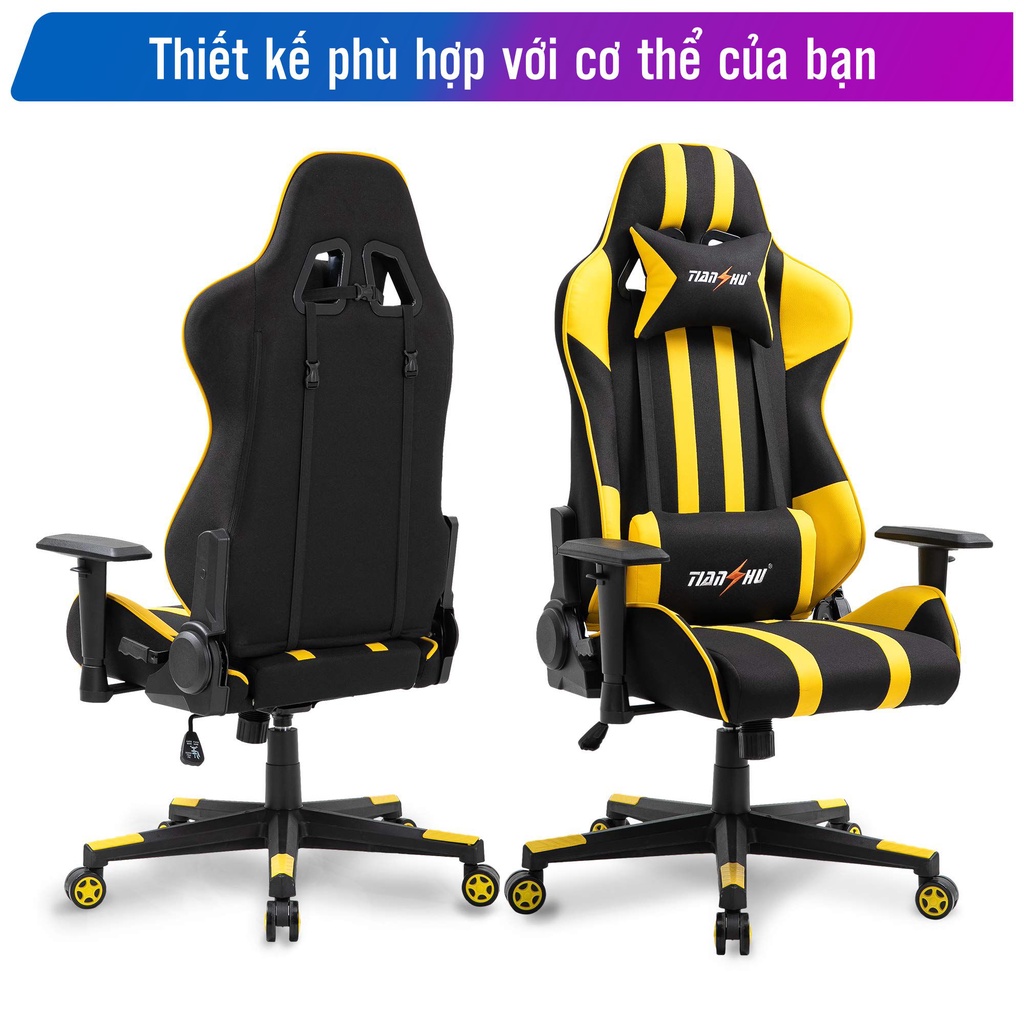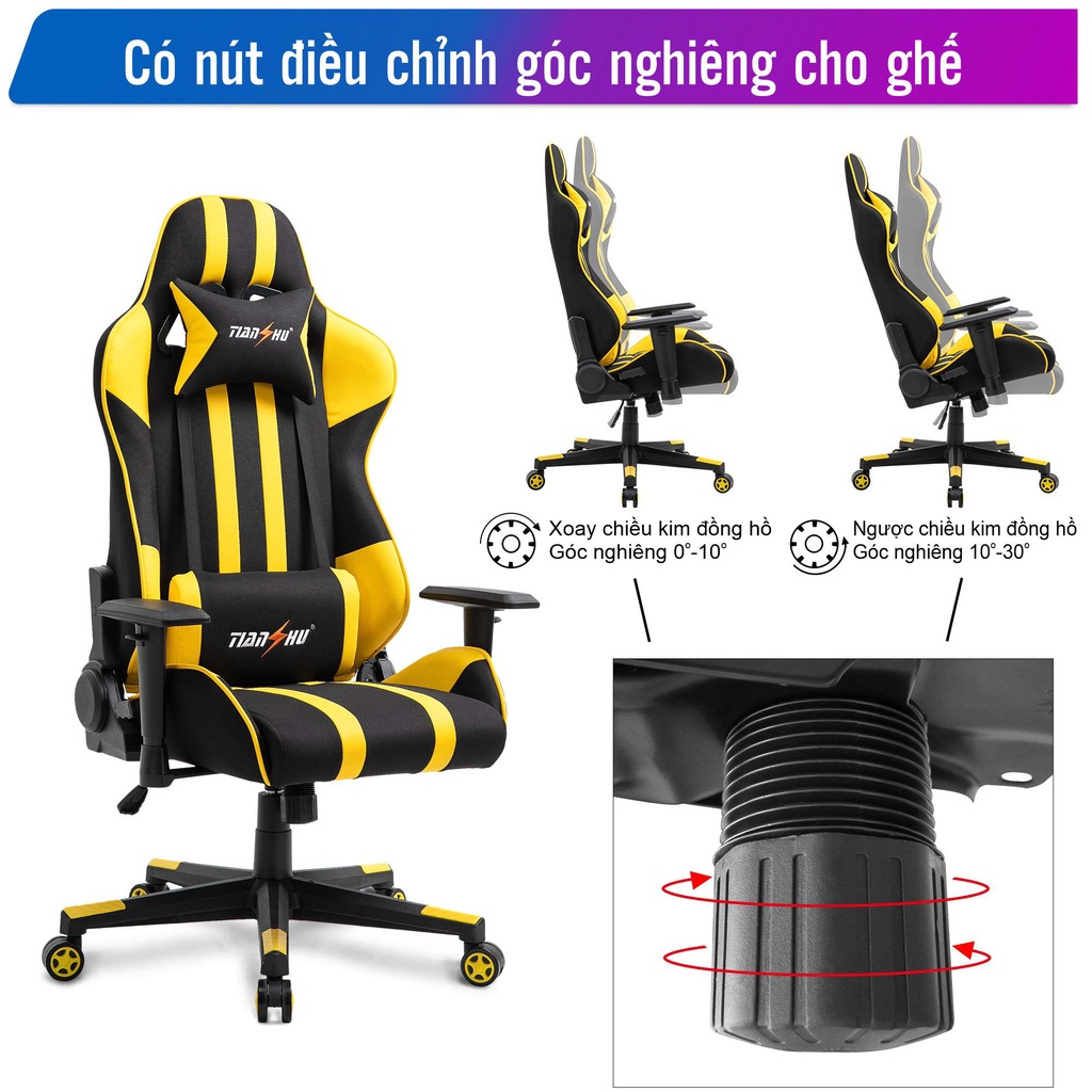 Ghế gaming - Ghế cao cấp dành cho game thủDòng ghế gaming Tianshu chính hàng đến từ Cửa hàng Nội Thất Fufutech giúp bạn yên tâm về chất lượng cũng như dảm bảo độ bền sản phẩm. Ghế có độ ngã lên đến 180 độ, thoải mái, vững chắc không làm bạn cảm giác bị với chân khi ngã lưng. Tạo độ thoải mái khi nằm thư giãn, hoặc ngồi lâu làm việc, chơi game không làm bạn bị mỏi.