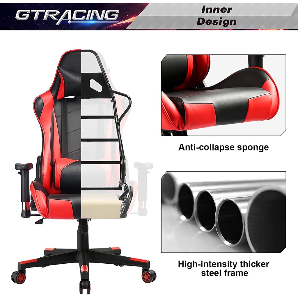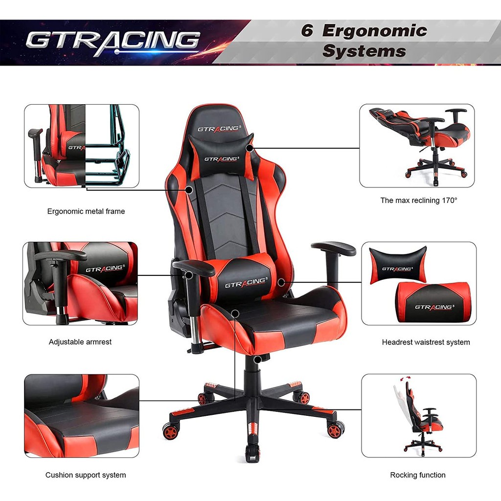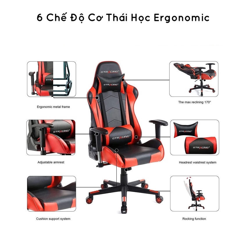 Thông tin chi tiết sản phẩm ghế Gaming GTRACINGGhế chơi game GTRACING là sự lựa chọn lý tưởng của bạn để làm việc, học tập và chơi game. Dòng GTRACING 099 với thiết kế tiện dụng là một trong những dòng cổ điển trong số các sản phẩm của chúng tôi. Với phần tựa đầu và gối thắt lưng có thể điều chỉnh được, giúp tạo sự thoải mái cho cả cột sống cổ và thắt lưng. Bộ điều chỉnh góc theo phong cách xe đua giúp bạn có thể ngả lưng và lắc lư cùng một lúc. Đệm ngồi và lưng ghế bằng bọt biển mật độ cao giúp bạn thoải mái sau cả ngày ngồi. Thiết kế tiện dụng và chất liệu cao cấp giúp ghế GTRACING hoàn hảo cho cả gia đình và văn phòng hiện đại.