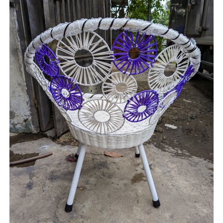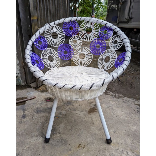 - Ghế cấu tạo từ khung cần sắt sơn tĩnh điện kết hợp đan nhựa giả mây theo lối đan hoa đồng tiền.
