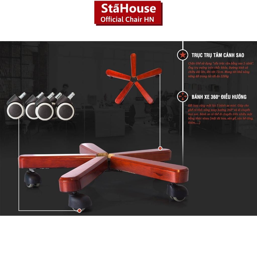 Chân ghế: Chân xoay gỗ tự nhiên sơn bóng, bánh xoay 360 độ