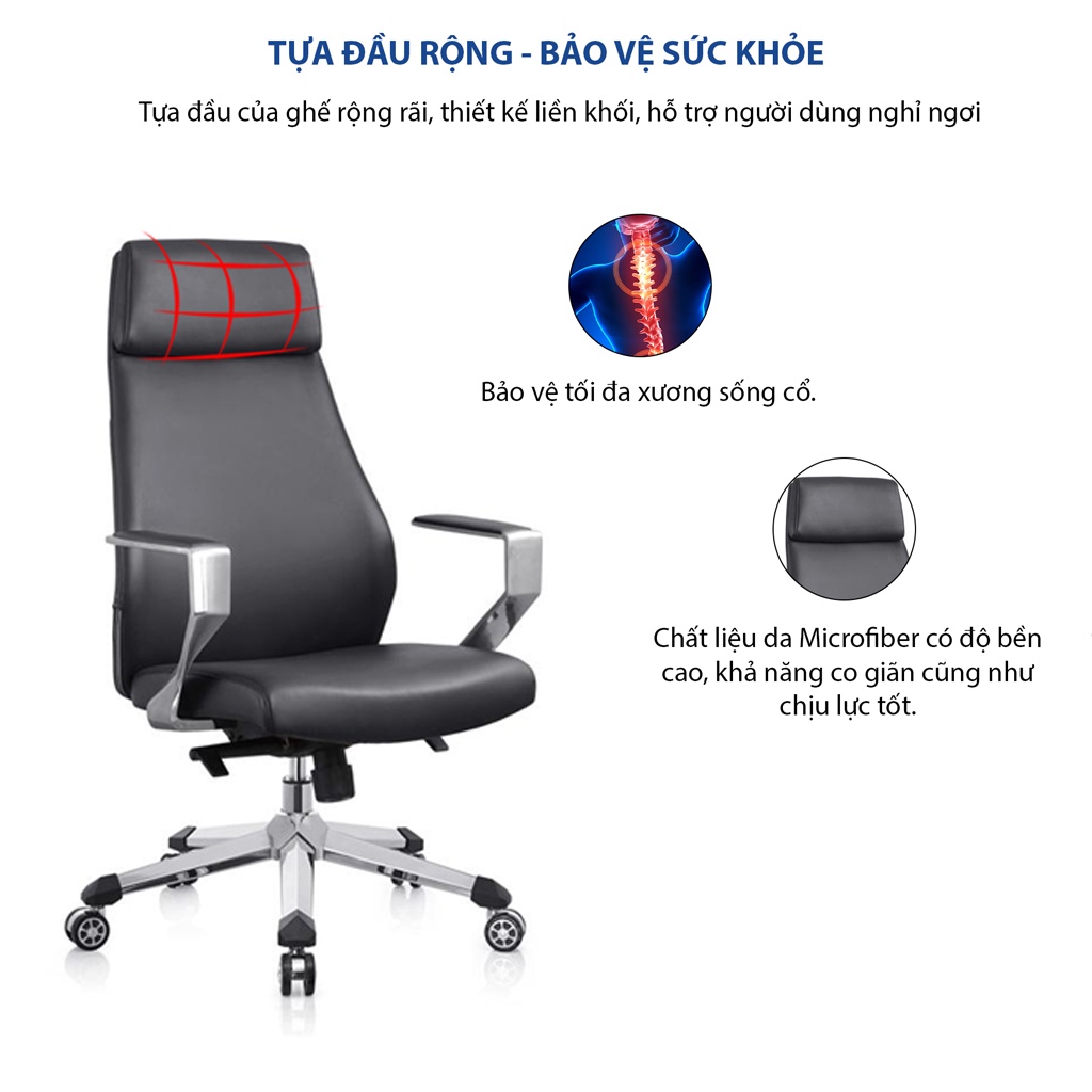+ Thiết kế lưng cao, ghế chân xoay với kiểu dáng hiện đại, kiến tạo không gian làm việc Sang trọng, Chuyên nghiệp, khẳng định đẳng cấp người dùng.