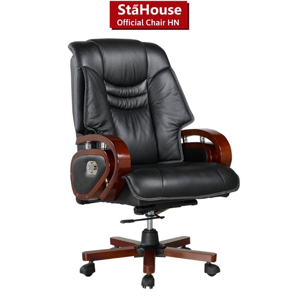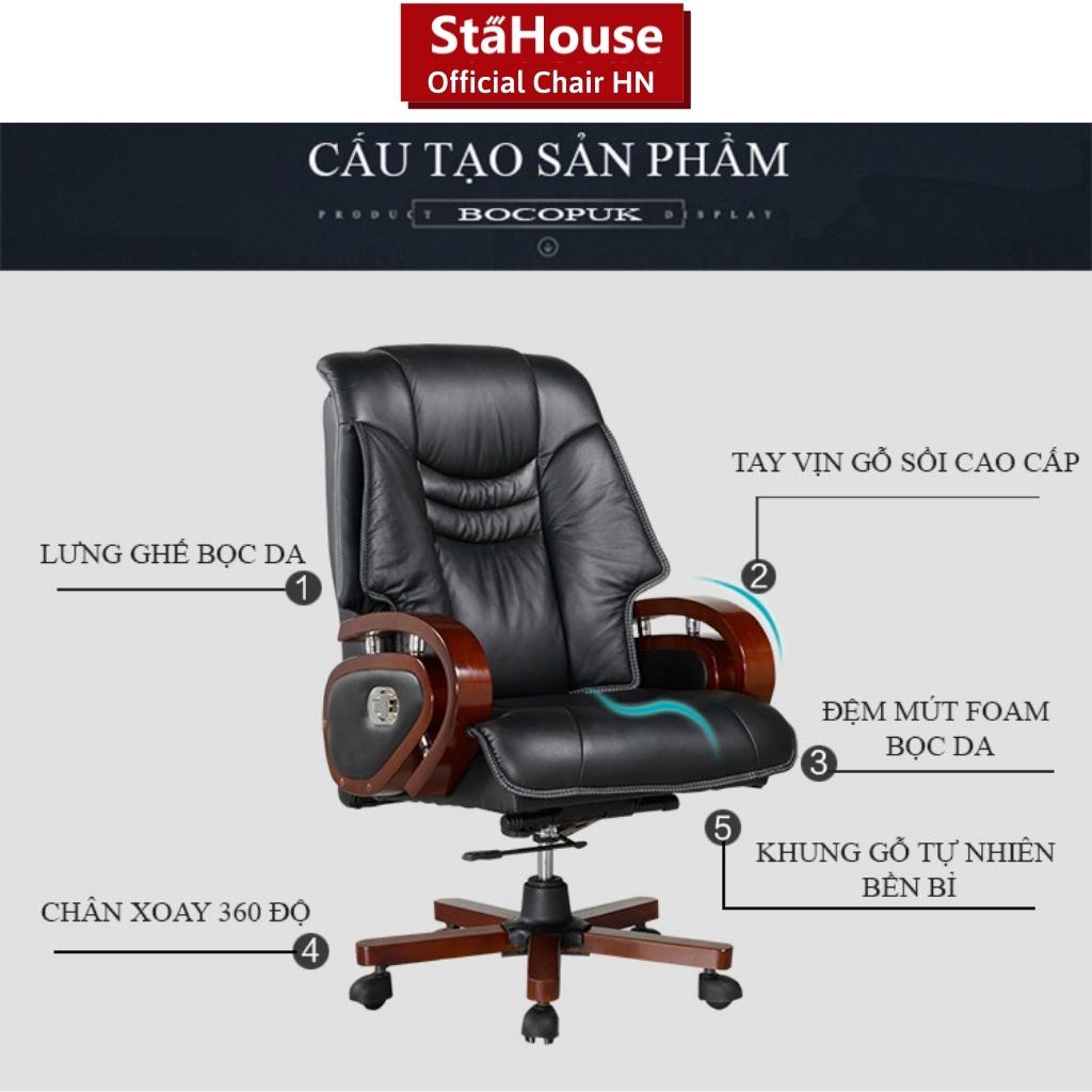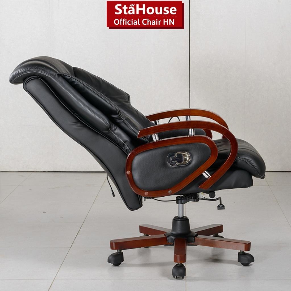 – Hai tay ghế được thiết kế tinh tế và đầy quyền lực, Khung và chân gỗ được chế tác trơn bóng tỉ mỉ, tạo cảm giác chắc chắn, sang trọng. Bên hông là lẫy kéo giúp ghế có thể ngã ra sau tiện lợi. Tay ghế vịn cố định hình tròn được làm bằng gỗ tự nhiên sơn PU 2 tầng và kết hợp ốp PVC 4 mặt sang trọng, độ cao vừa tầm với mặt bàn làm việc, không gây cản trở khi đẩy vào hoặc đẩy ra.