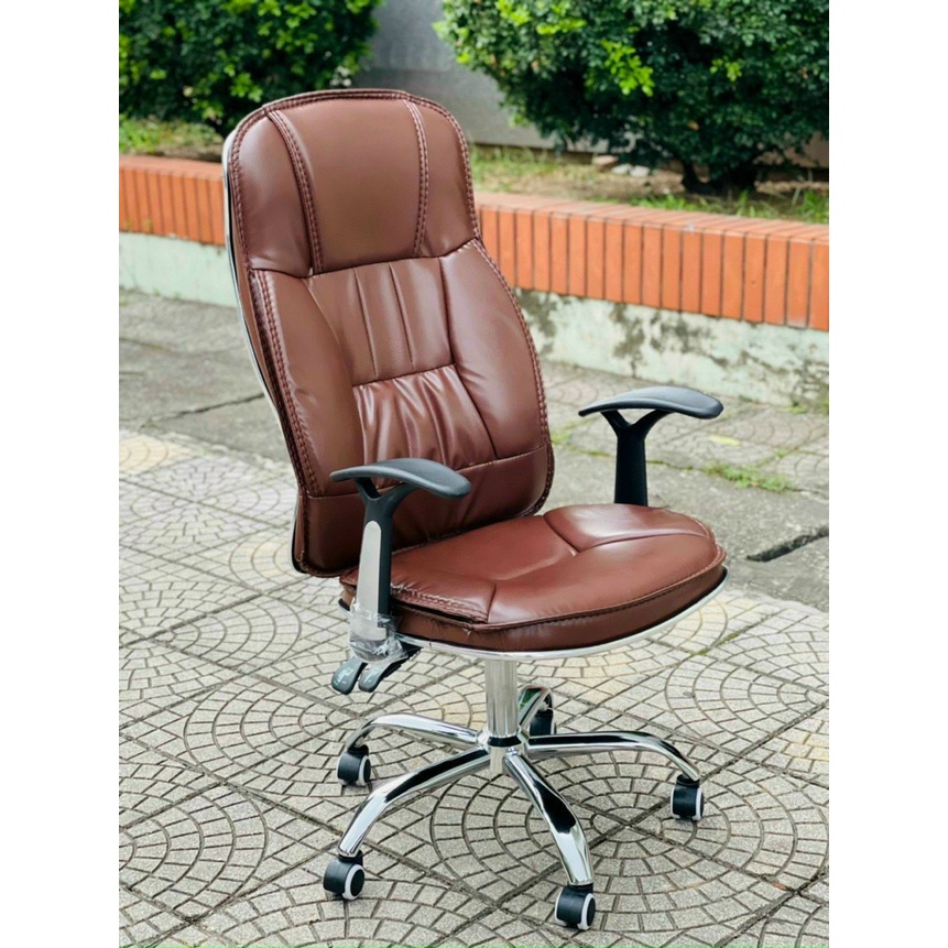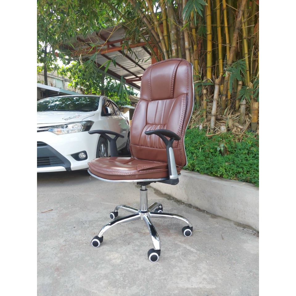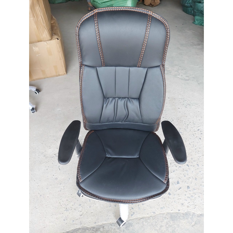 Đây là một mẫu ghế giám đốc hay ghế trưởng phòng có thiết kế khá đẹp mắt và sang trọng. Mặt ngồi và lưng ghế được thiết kế với lớp nệm mút dày, kiểu dáng ôm lưng giúp người ngồi có thể thoải mái và thư giản. Hai bên là hai phần tay dựa rất gọn và tiện dụng. Bên dưới là kết cấu chân ghế với chất liệu sắt mạ Crome sáng bóng sang trọng. Thêm vào đó là phần bánh xe lăn giúp bạn có thể dễ dàng di chuyển qua lại.Giữa phần chân ghế và mặt nệm ghế là bộ phận tăng thủy lực giúp bạn có thể dễ dàng cân chỉnh chiều cao của ghế, phù hợp với chiếu cao mặt bàn sử dụng. Mẫu ghế này còn một đặc điểm nỗi bật mà bạn không thể bỏ qua đó là phần lưng ghế có thể ngã ra phí sau, cho bạn một trãi nghiệm thư giản không thể tuyệt vời hơn trong những giờ giải lao, nghỉ trưa…