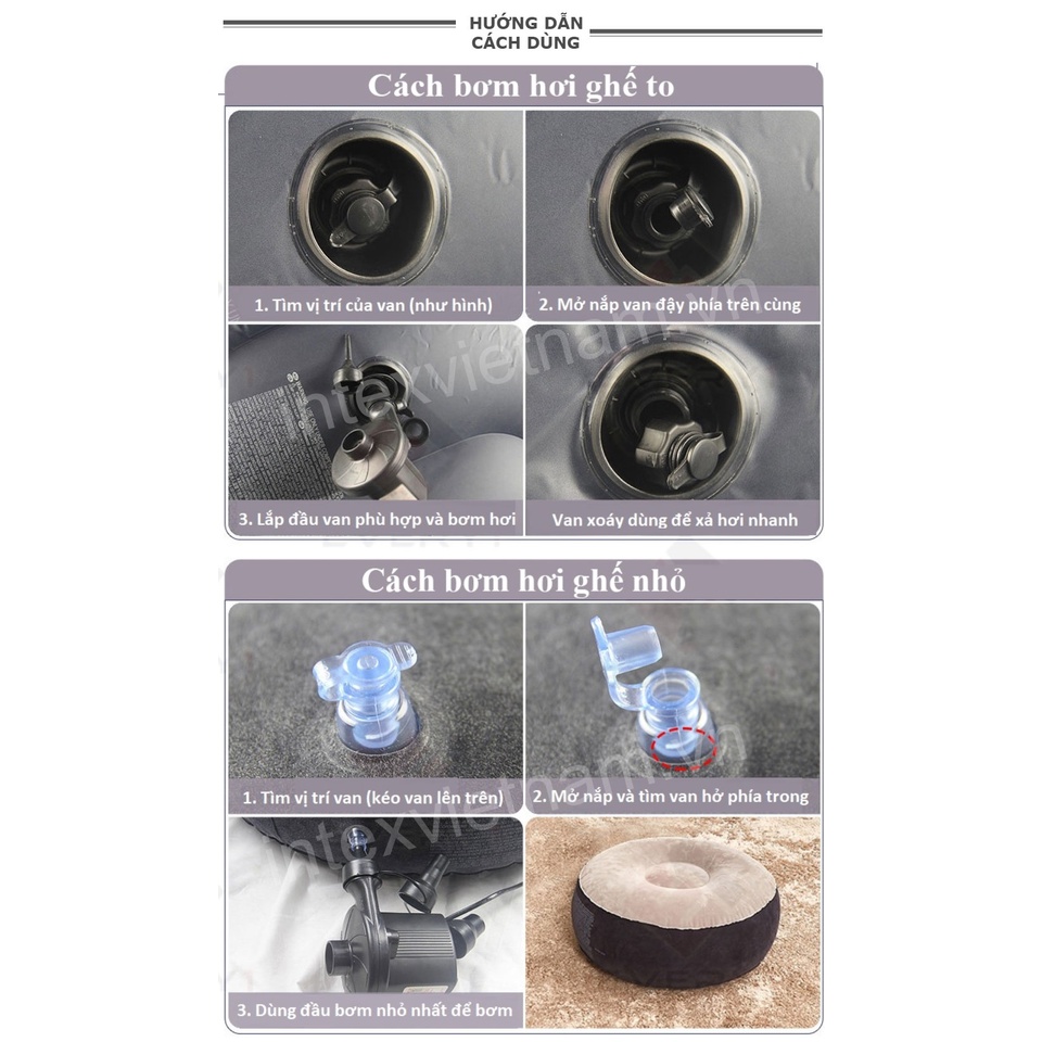 - Ghế bơm hơi được sử dụng để xem TV, đọc sách, hoặc thậm chí để ngủ bất cứ khi nào bạn cảm thấy mệt, sản phẩm này sẽ phồng lên, xẹp xuống trong vài phút. Do đó, chúng ta có thể dễ dàng làm sạch và thu gọn để cất giữ hay di chuyển sản phẩm ghế bơm hơi.